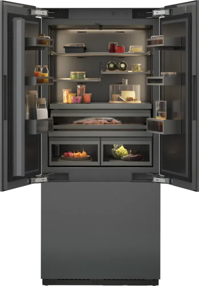Встраиваемый холодильник Gaggenau RVY497190 представляет премиальный дизайн 400 series и изготавливается под навес вашего фасада, обеспечивая бесшовную интеграцию в кухонный гарнитур. Французская конструкция дверей с тремя полотнами и скрытыми ручками создает аккуратный внешний вид и гарантирует удобный доступ к продуктам, а монтаж по системе door on door позволяет добиться идеально ровной линии фасадов с надежным креплением.