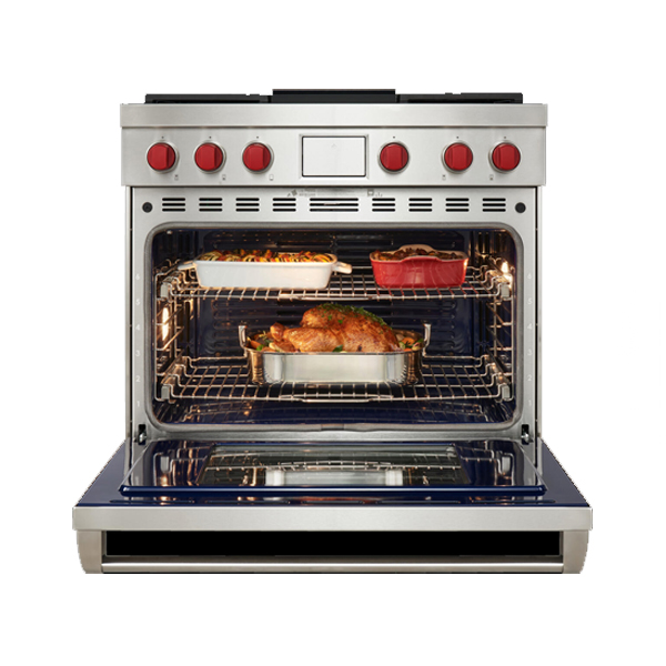 Система двойной конвекции Wolf Dual VertiCross отвечает за равномерную температуру воздуха внутри духовых шкафов и создание особой циркуляции горячего воздуха. Данная технология позволяет одновременно готовить на нескольких уровнях духового шкафа.