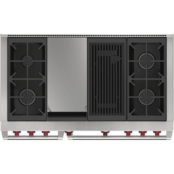 Газовая варочная поверхность состоит из четырёх горелок, мощностью от 2,7 кВ (для топления) до 5,3 кВ (для быстрого закипания и интенсивной обжарки) . Запатентованная двухуровневая конструкция газовой конфорки Wolf позволяет максимально точно контролировать температуру нагрева. Система искрового реподжига автоматически зажигает горелку при её заливе.