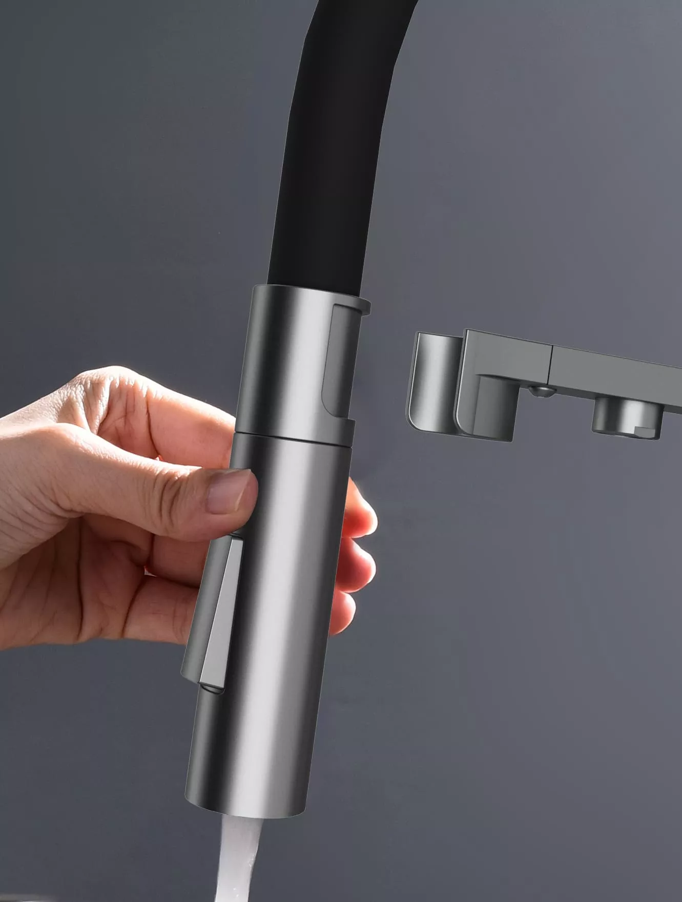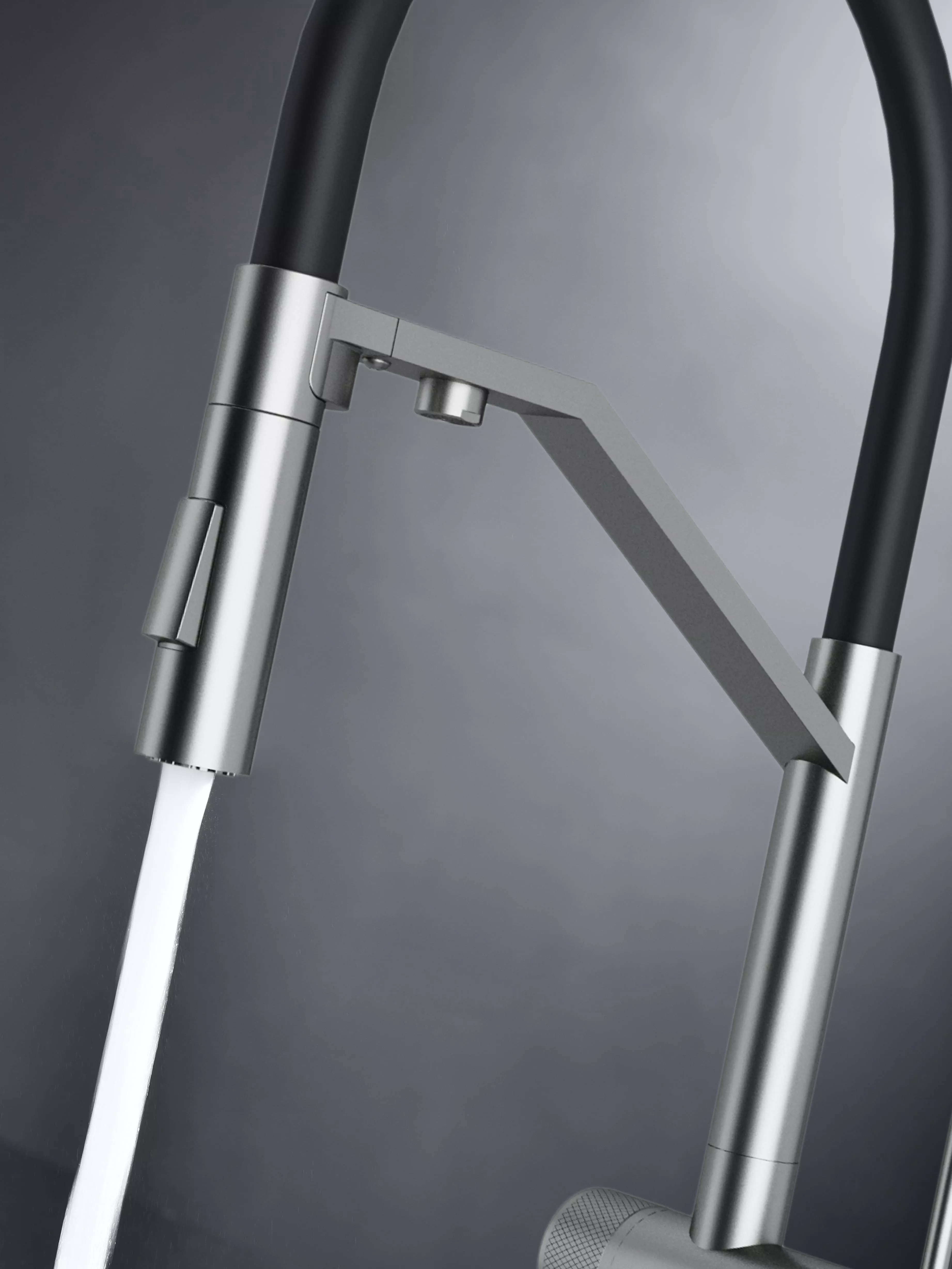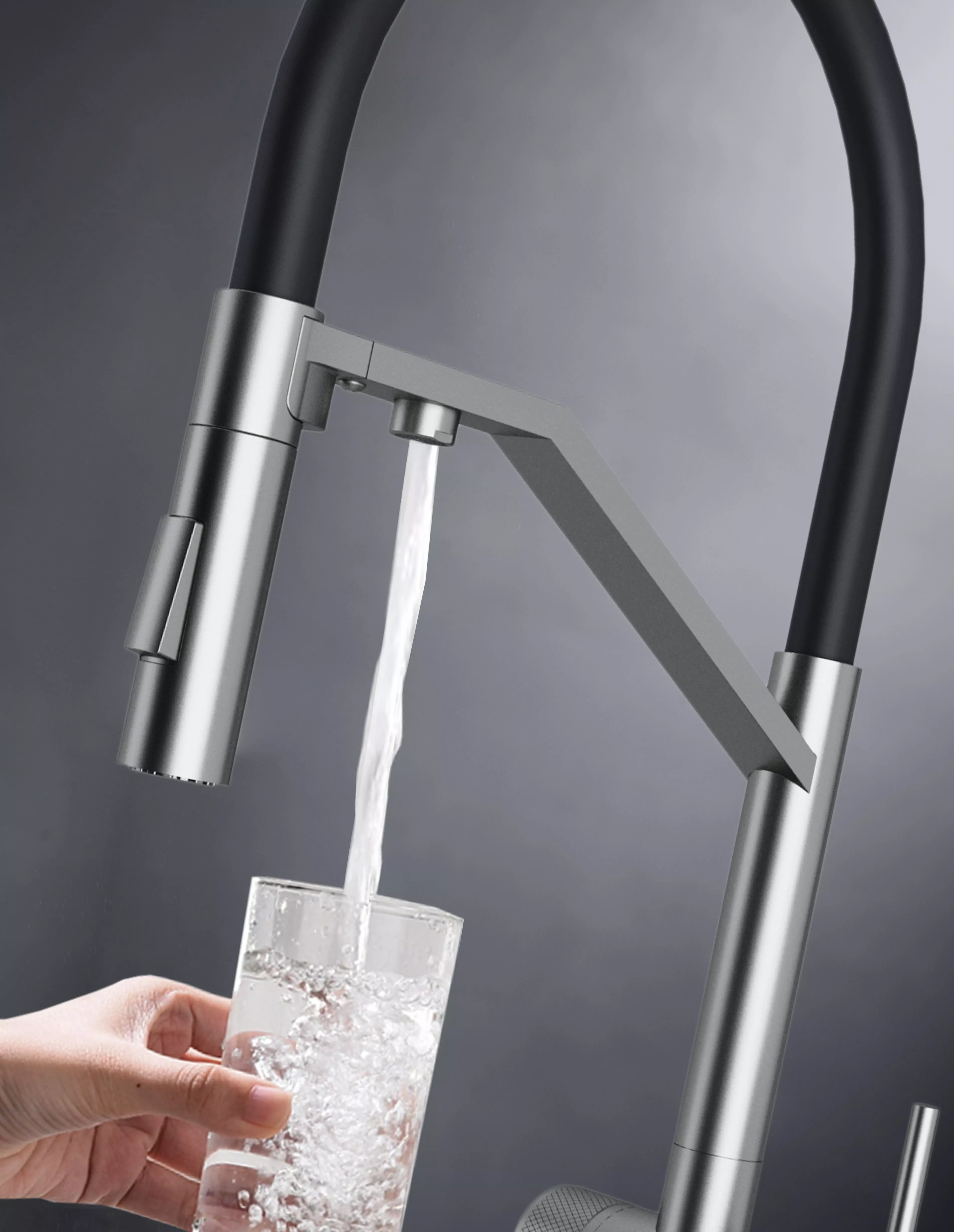 Многофункциональный смеситель для кухни ZENDER оснащен функциями подключения фильтра питьевой воды и гибким силиконовым изливом с двумя режимами подачи водопроводной воды: струя и душ. Для переключения между этими режимами предусмотрена удобная кнопка на конце излива. Управление подачей очищенной питьевой воды осуществляется поворотом специальной ручки, расположенной слева и имеющей декоративные лазерные насечки, при этом вода подается через отдельный аэратор.